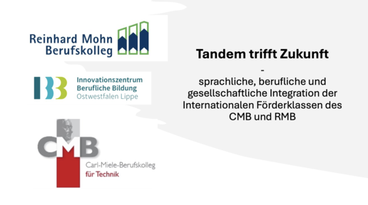 Mit dem Projekt „Tandem trifft Zukunft“ setzen das Carl‑Miele‑Berufskolleg Gütersloh (CMB) und das Reinhard‑Mohn‑Berufskolleg Gütersloh (RMBK) im Rahmen der Projekte des IBB OWL (www.ibb-owl.de) ein starkes Zeichen für gelingende Integration in OWL. Die beiden Berufskollegs begleiten Internationale Förderklassen gemeinsam auf dem Weg in schulische, berufliche und gesellschaftliche Teilhabe und zeigen, wie wertvoll eine Kooperation von Berufskollegs sein kann.